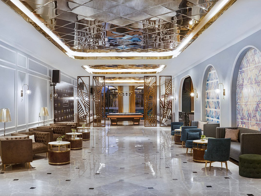 로비 중앙에는 화려한 샹들리에가 매달려 있습니다.