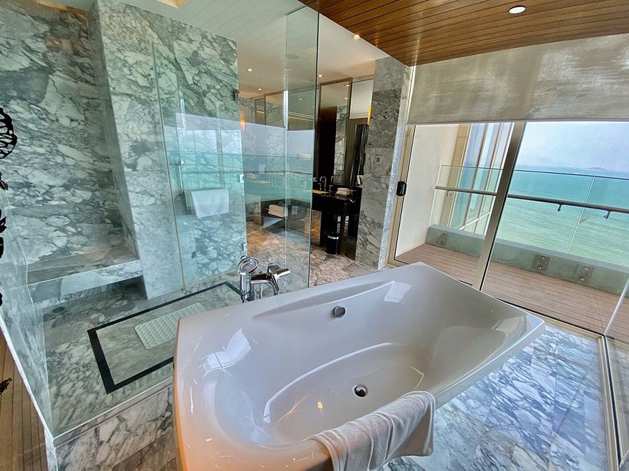 푸른 바다와 하늘이 맞닿는 듯한 인피니티 풀에서