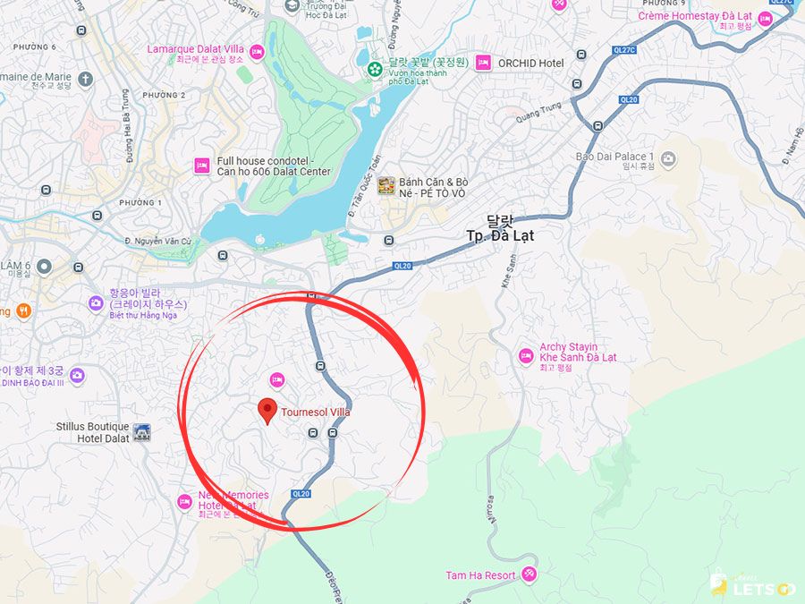 투르네솔 빌라는 달랏 시내 중심에서 차로 10분 정도 떨어진 조용한 주택가에 자리하고 있어요. 구글 맵 찍으면 잘 나와서 어렵지 않게 찾을 수 있답니다. 숙소 근처에 유명한 관광지도 많아서, 달랏 기차역, 쑤언흐엉 호수, 달랏 야시장 등도 부담 없이 다녀올 수 있어요!