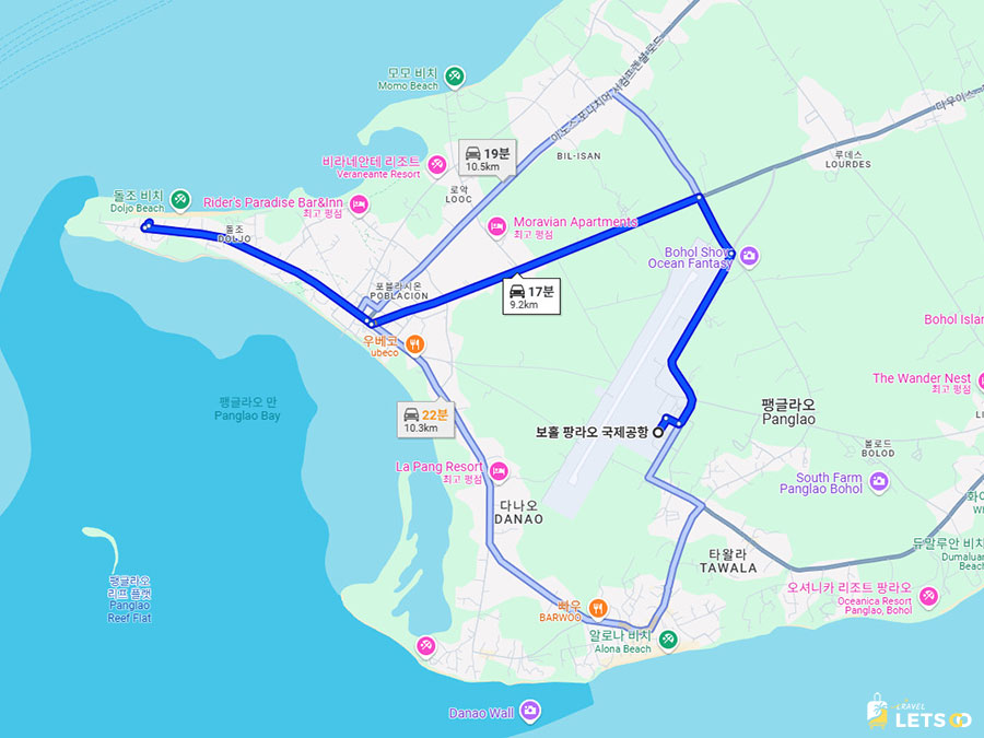 팡라오 국제공항(Bohol–Panglao International Airport)에서 차로 약 15분 정도 거리라 이동도 편하고요.