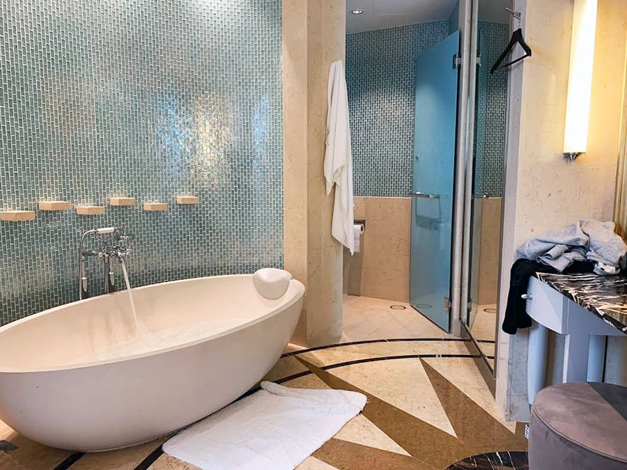 욕실엔 대형 욕조와 스팀 사우나, 세면대도 2개라 동선이 편하고,