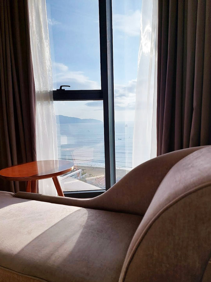 파리 델리 다낭 비치 호텔은 4성급 호텔이지만, 뷰나 위치는 5성급 부럽지 않아요. 가장 마음에 들었던 건 뭐니뭐니해도 미케비치가 정면으로 보이는 오션뷰 객실이었어요.