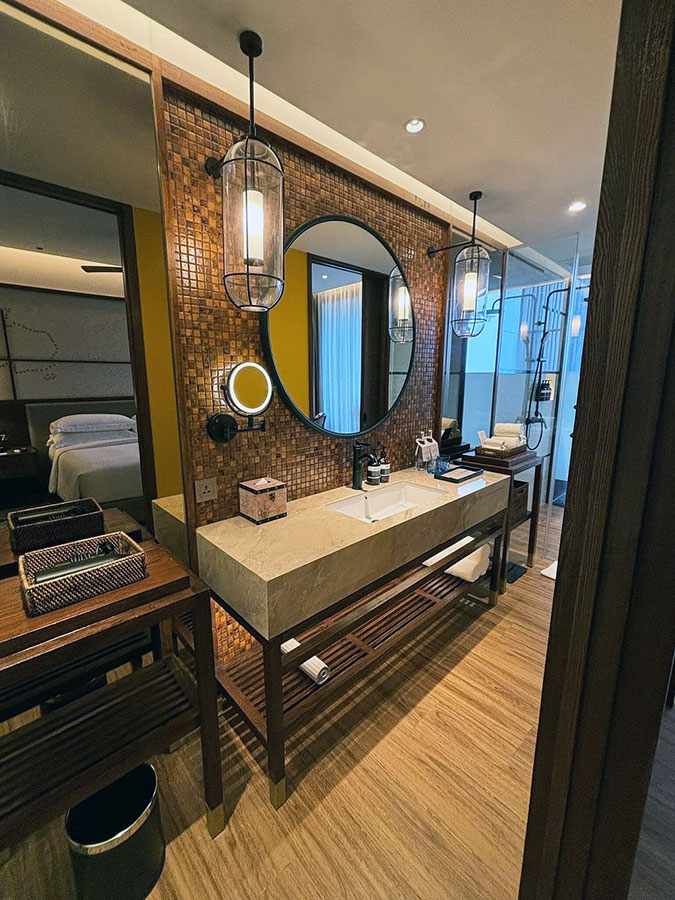 페리 터미널에서 차로 10분쯤 달려 도착하니, 정문부터 뭔가 남다른 분위기가 느껴졌어요. 로비가 바다 위 어망 마을(kelong)을 모티브로 지어져 있어서, 들어서자마자 현지 감성이 팍! 오더라구요.