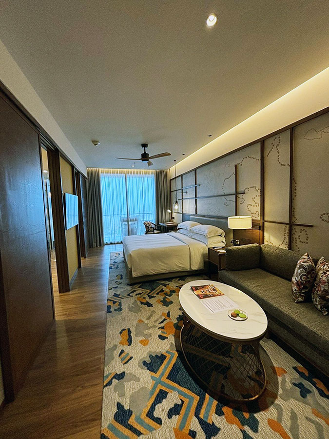 제가 묵은 건 원베드룸 스위트였어요. 방에 들어가자마자 통유리창 너머로 펼쳐진 바다뷰가 눈을 사로잡았죠🌊.