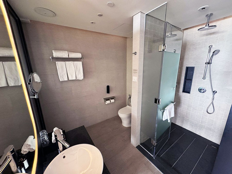 객실 안에는 넷플릭스 연결 가능한 스마트 TV, 미니바, 커피머신, 넉넉한 옷장 등이 구비되어 있었고, 욕실도 엄청 넓었어요.