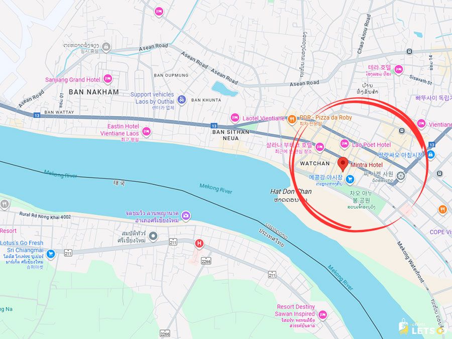 비엔티안 시내 중심에 있어서 이동이 진짜 편리했어요. 탓 루앙(Tat Luang), 왓 씨사깨 사원, 그리고 야시장까지 모두 가깝고, 근처에 카페랑 식당도 많아서 밥 걱정할 일 없었어요.