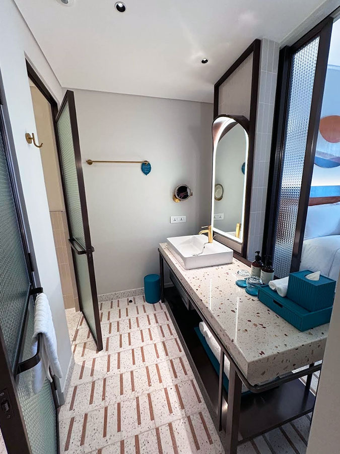객실 인테리어는 우드톤 + 대리석 조합으로 깔끔하고 세련된 느낌.