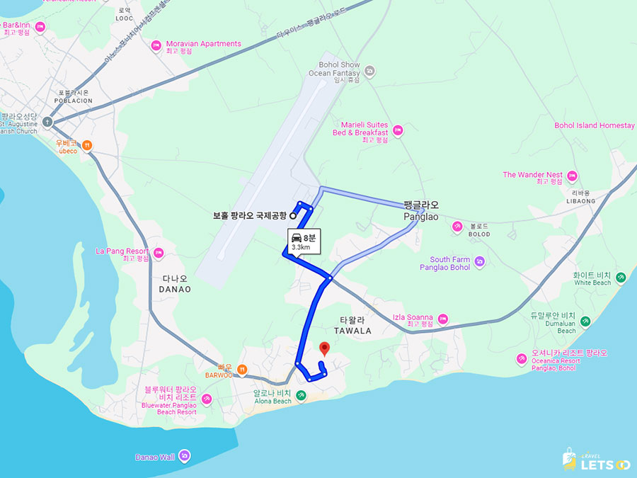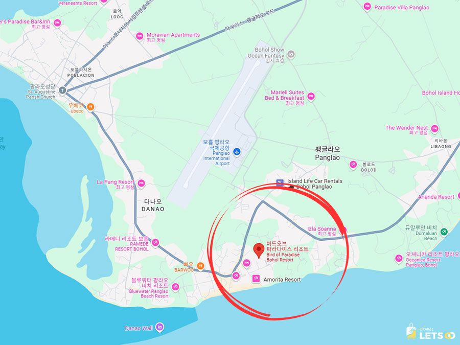 리조트는 알로나 비치에서 도보로 갈 수 있는 거리(약 10~15분 걷기 혹은 짧은 트라이시클 이동)라 해변 액세스가 좋아요. 공항(Bohol–Panglao International Airport)에서 차로도 가깝고, 주변에 레스토랑과 카페가 모여 있어 저녁에 나가기도 편했어요.