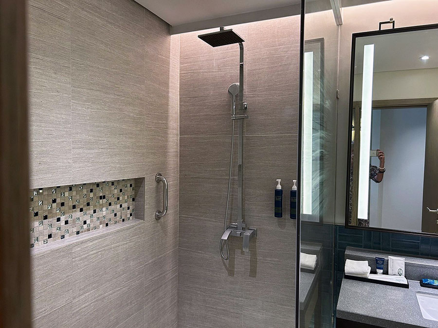욕실은 깔끔하고 물 수압도 좋아서 하루 활동 마치고 샤워할 때 기분 좋았어요. 객실 전반이 청결하게 관리되는 점도 마음에 들었어요.