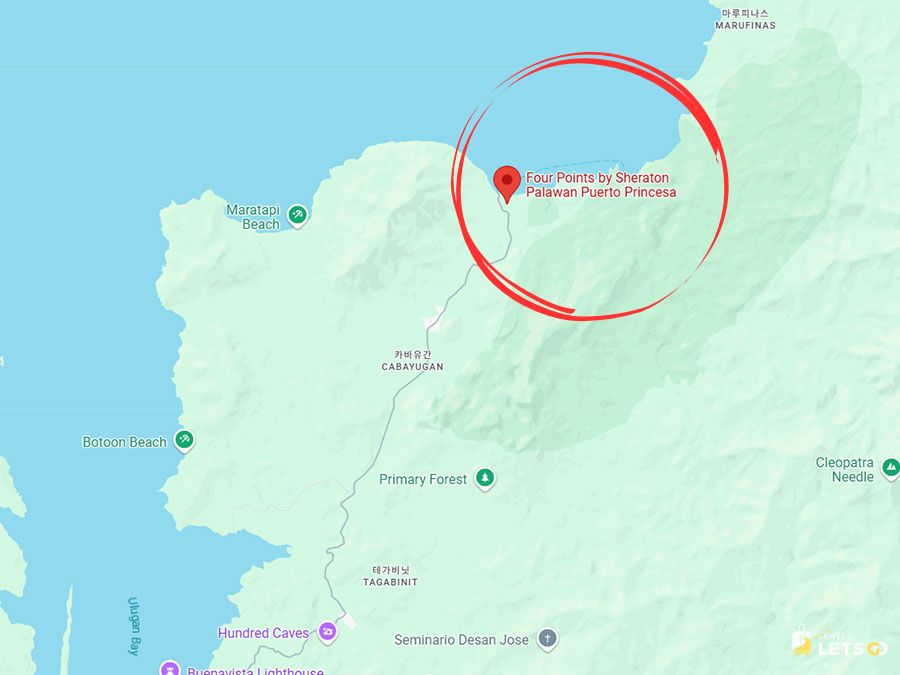 호텔은 사방 해변 쪽에 위치해 있어 푸에르토 프린세사 중심에서 조금 벗어난 ‘자연 가까운’ 위치예요. 유명한 Puerto Princesa Subterranean River(지하강) 투어 출발지와도 거리가 가까워 투어 예약하기 편하다는 장점이 있어요.
