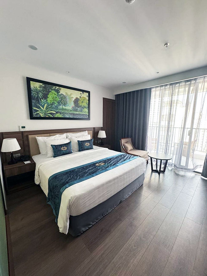 방 문을 열자마자 "와!" 했던 건 바로 바닥 때문이었어요. 베트남 호텔 특유의 꿉꿉한 카펫이 아니라, 전 객실이 아주 깔끔한 마룻바닥(우드 플로어)으로 되어 있거든요. 🛏️ 먼지 걱정 없이 맨발로 다녀도 뽀송뽀송해서 비염 있는 저에게는 그야말로 천국이었죠.