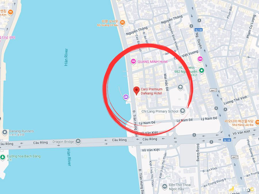 지도를 보면 아시겠지만, 위치가 진짜 깡패예요. 한강(Han River) 바로 앞에 있어서 산책하기 너무 좋고, 다낭 랜드마크인 **용다리(Dragon Bridge)**랑 사랑의 부두가 걸어서 코앞입니다.