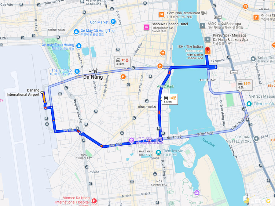 🚶♀️ 밤에 선짜 야시장(Son Tra Night Market) 가서 해산물 먹고 구경하다가 슬슬 걸어 들어오기 딱 좋은 거리! 시내 관광하기엔 미케비치 쪽보다 여기가 훨씬 편하더라고요.