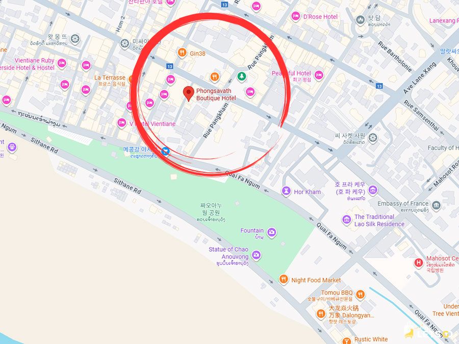 저녁에 슬슬 걸어 나가서 길거리 음식 사 먹고 구경하다가 돌아오기 딱 좋은 동선이죠. 주변에 환전소나 마사지 샵도 많아서 비엔티안 뚜벅이 여행자들에겐 이보다 더 좋은 위치는 없을 거예요. 🏙️