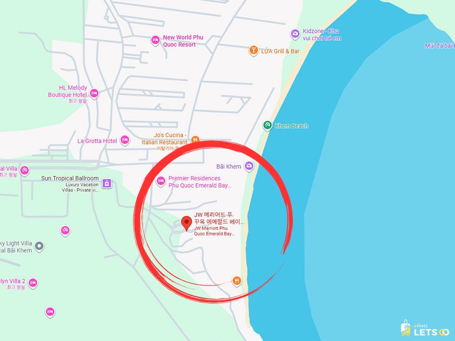 위치는 푸꾸옥 섬의 남동쪽 끝자락, 에메랄드빛 켐 비치(Khem Beach)에 있어요. 🚗 시내인 즈엉동과는 거리가 좀 있지만, 그만큼 세상 조용하고 프라이빗하게 휴식에만 집중할 수 있다는 게 큰 매력이에요.