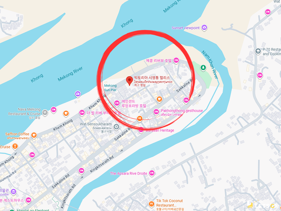 메콩강 바로 앞이라 저녁에 강변 산책하기에도 좋고, 야시장이나 메인 거리도 슬슬 걸어 다니기 딱 좋은 거리랍니다. 조용한 휴식과 관광 사이의 밸런스가 정말 갓벽해요! 📍