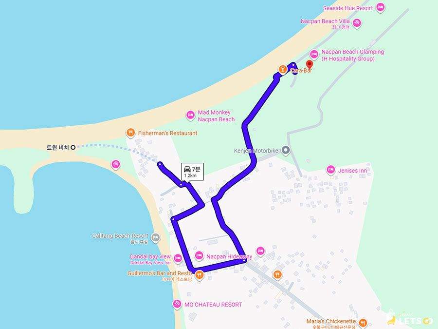 주소는 말 그대로 낙판 비치(Nacpan Beach) 바로 앞이에요! 📍 엘니도 시내에서는 차로 40~50분 정도 걸리지만, 그만큼 한적하고 조용하게 휴식을 즐길 수 있어요.
