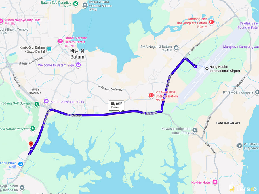 위치가 시내 중심은 아니지만, 바탐 센터 페리 터미널에서 차로 15~20분 정도면 도착해요. 항 나딤 공항이랑도 가까워서 이동하기 딱 좋더라고요.