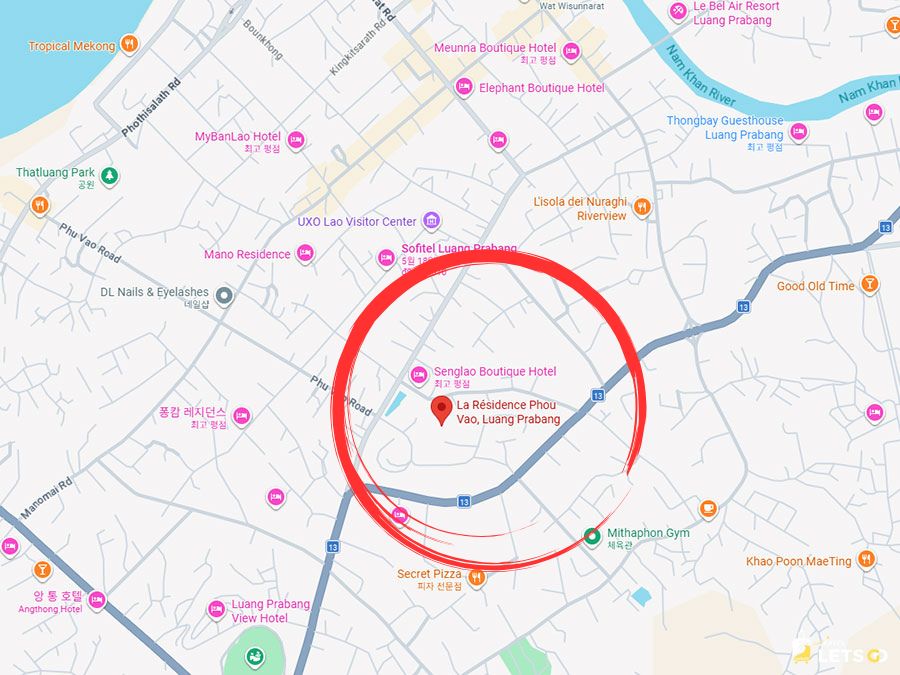 루앙프라방 시내(야시장 거리)에서 차로 딱 5~10분 정도 거리에 있어요. 너무 중심가면 시끄러울 수 있는데, 여기는 언덕 위라 정말 고요해요.