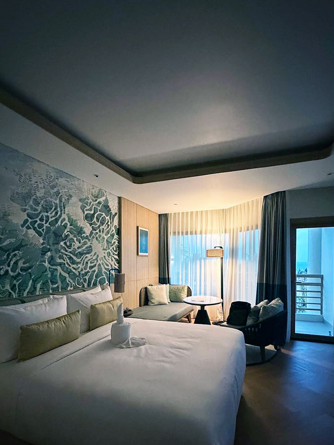 객실 문을 여는 순간, 세련된 인테리어에 입이 떡 벌어졌어요. 저는 라군 뷰 객실에 묵었는데, 테라스에서 바라보는 풍경이 비현실적일 정도로 예뻐요.