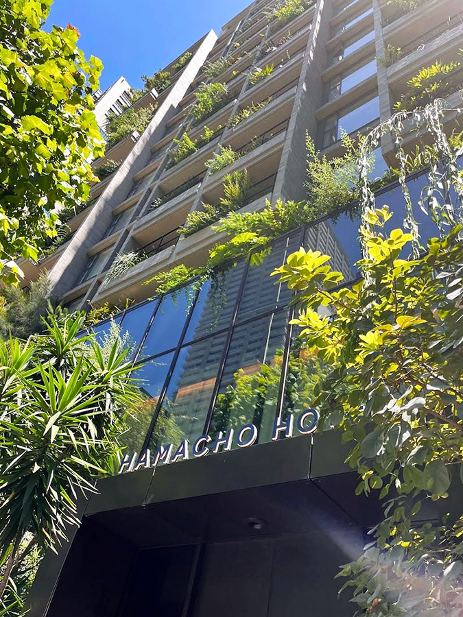 하마초 호텔은 일단 외관부터 범상치 않아요! 콘크리트와 초록 식물들이 어우러진 디자인이 정말 세련됐거든요.