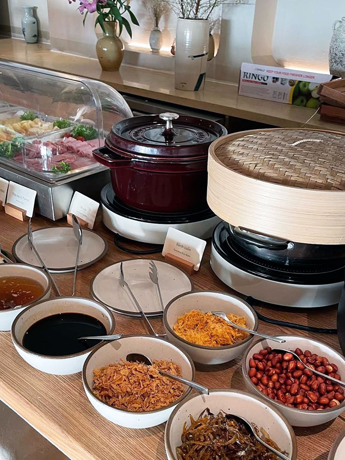 메뉴가 엄청 방대하진 않아도 베트남 현지식 쌀국수부터 신선한 과일, 오믈렛까지 알차게 준비되어 있어요. 🥐