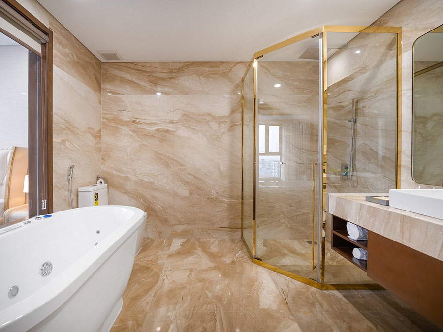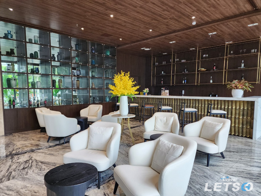 높은 천장과 대리석 바닥이 있으며 현대적인 가구와 전통 베트남 예술로 꾸며져 있습니다.